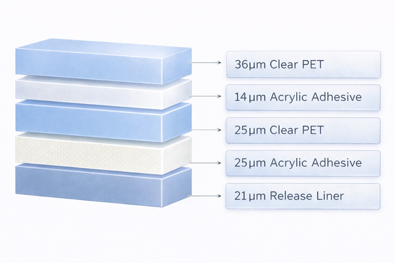 PET フィルムを基材とし、アクリル系粘着剤を用いた多層構造により、バッテリーセル外装の保護と安定した絶縁性能を提供します。